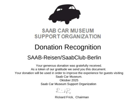 Spendenquittung für 2024: Wir sind „Saab Car Museum SUPPORTER“